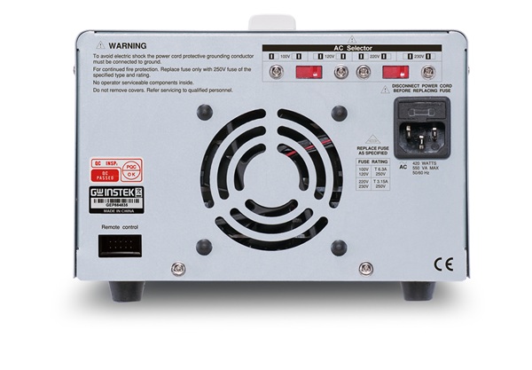 The GPS-Series is 2-4 channel, 180 to 200W output, linear DC power supplies. Overload and reverse polarity protection, and an output on/off switch keep the GPS-Series and their load safe from unexpected conditions. A High regulation (0.01%+3mV) and low ripple/noise (< 1mVrms, 5Hz~1MHz) are maintained for channel 1 and 2 in constant voltage mode. Automated cooling fan speed control minimizes fan noise according to load conditions, ensuring quiet operation. The GPS-Series is an ideal solution for lightweight, inexpensive bench-top or portable applications requiring high regulation and multiple outputs.